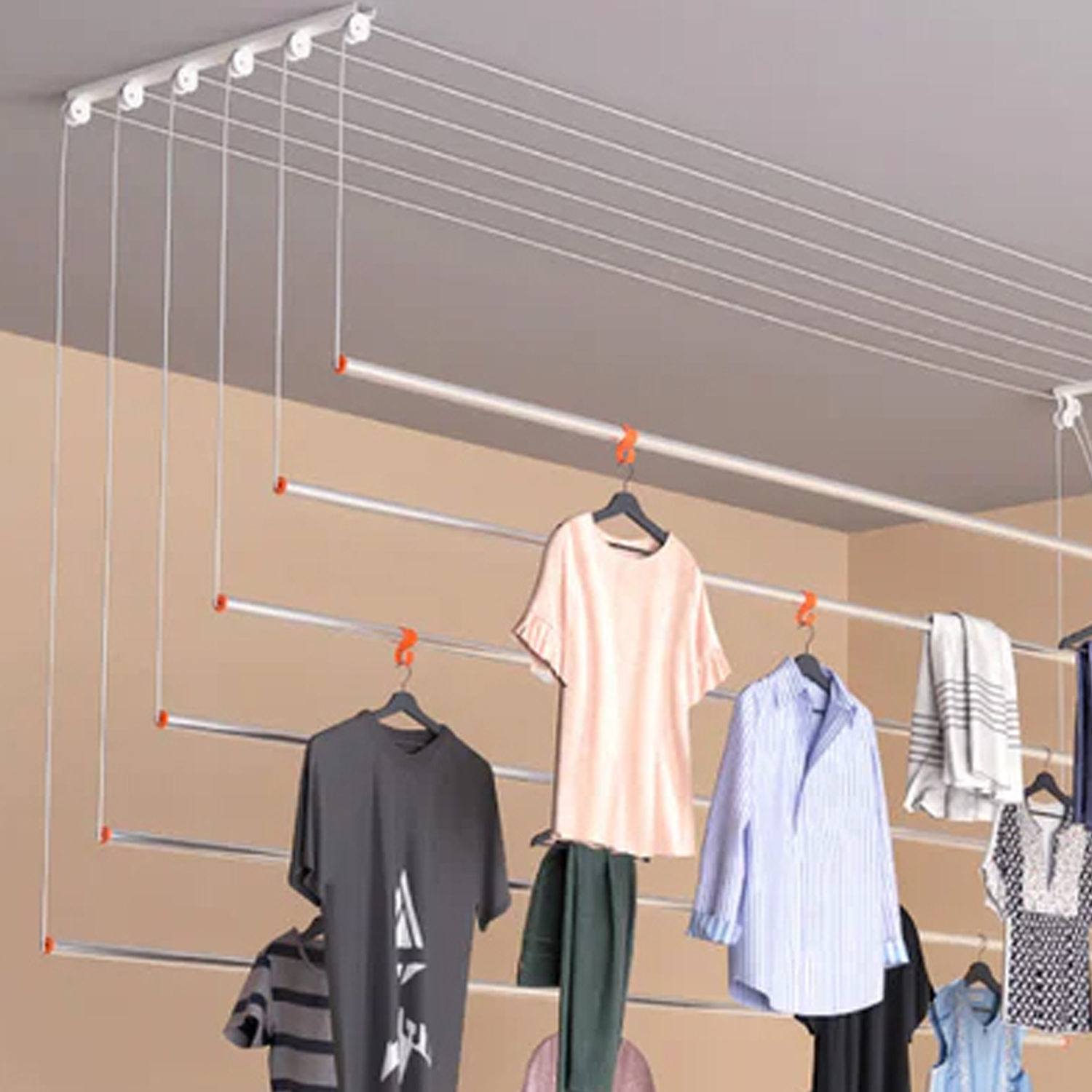 Ryanex hangers consumes less space and Drys clothes faster as the temperature is high at the ceiling. It's Made up of 6 pipe which can be lowered individually to hang clothes and then can be mounted to the ceiling effortlessly. Good weight bearing capacity, up to 5 kgs per pipe Number of pipes and size of pipes can be customized as per Customer needs. These hangrs uses No Floor Space at all (Effortless operation for all ages) Uses minimum space to dry maximum clothes at one stretch Can be easily shifted and carried to any place or transported to anywhere in India Gain privacy by drying cloths indoors.